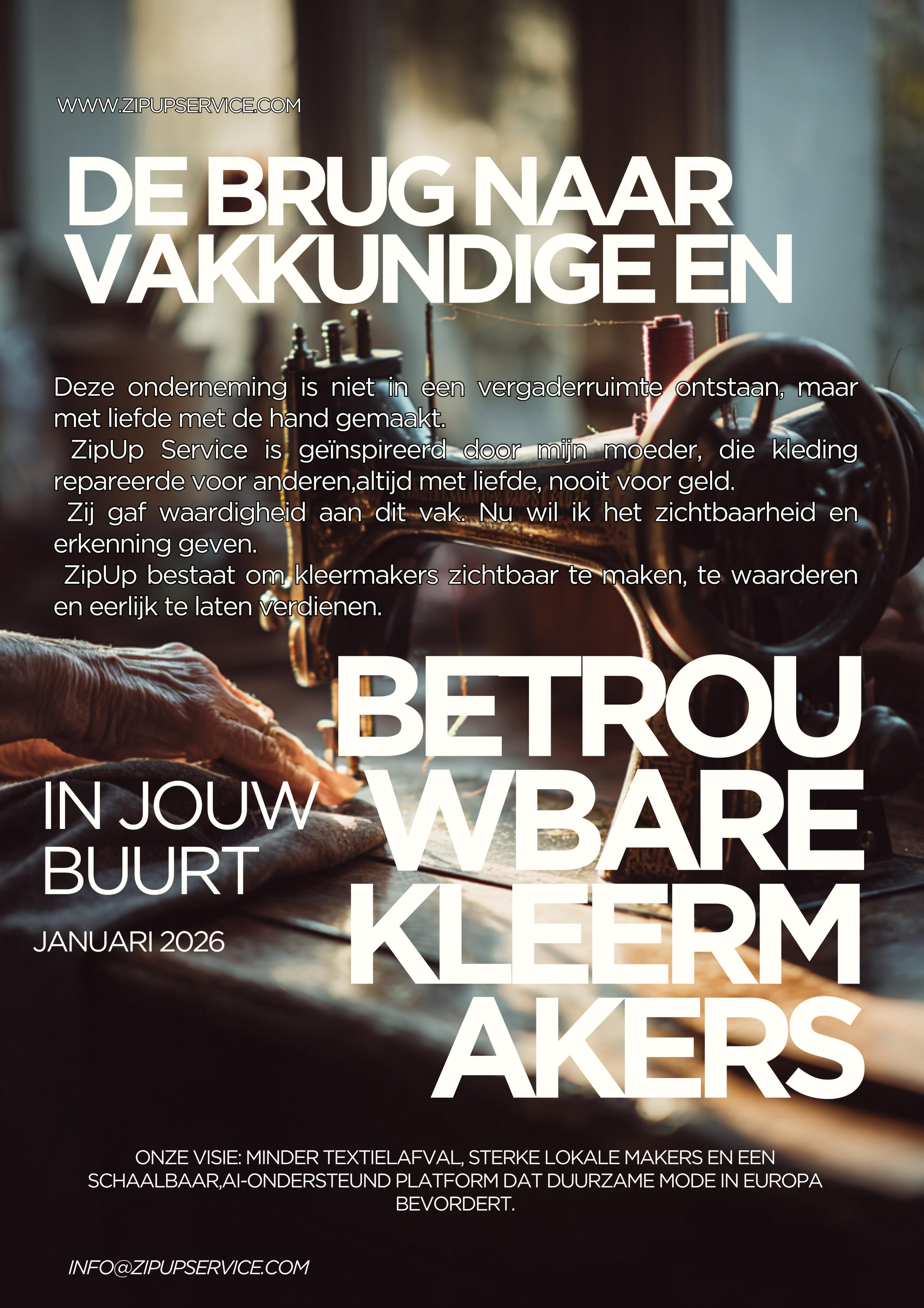 Wij brengen getalenteerde kleermakers, makers en klanten samen die kwaliteit, creativiteit en lokaal vakmanschap waarderen. Van kleine kledingreparaties tot op maat gemaakte kleding – Zip Up maakt het eenvoudig om elkaar te vinden, samen te werken en kleding langer in omloop te houden.